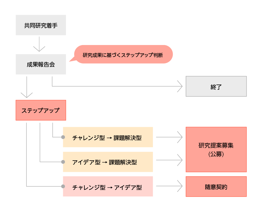 公平性の観点から課題解決への有望な競合他社の可能性を考慮し、同課題の共同研究に関する研究提案募集(公募)を行った上、選定された相手方と「課題解決型」の研究を行います。