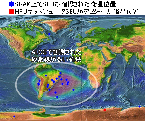 陸域観測技術衛星(ALOS)で観測された放射線が多い領域と、SDS-1/AMIで観測された放射線によるデータ反転(SEU)の発生場所を比較