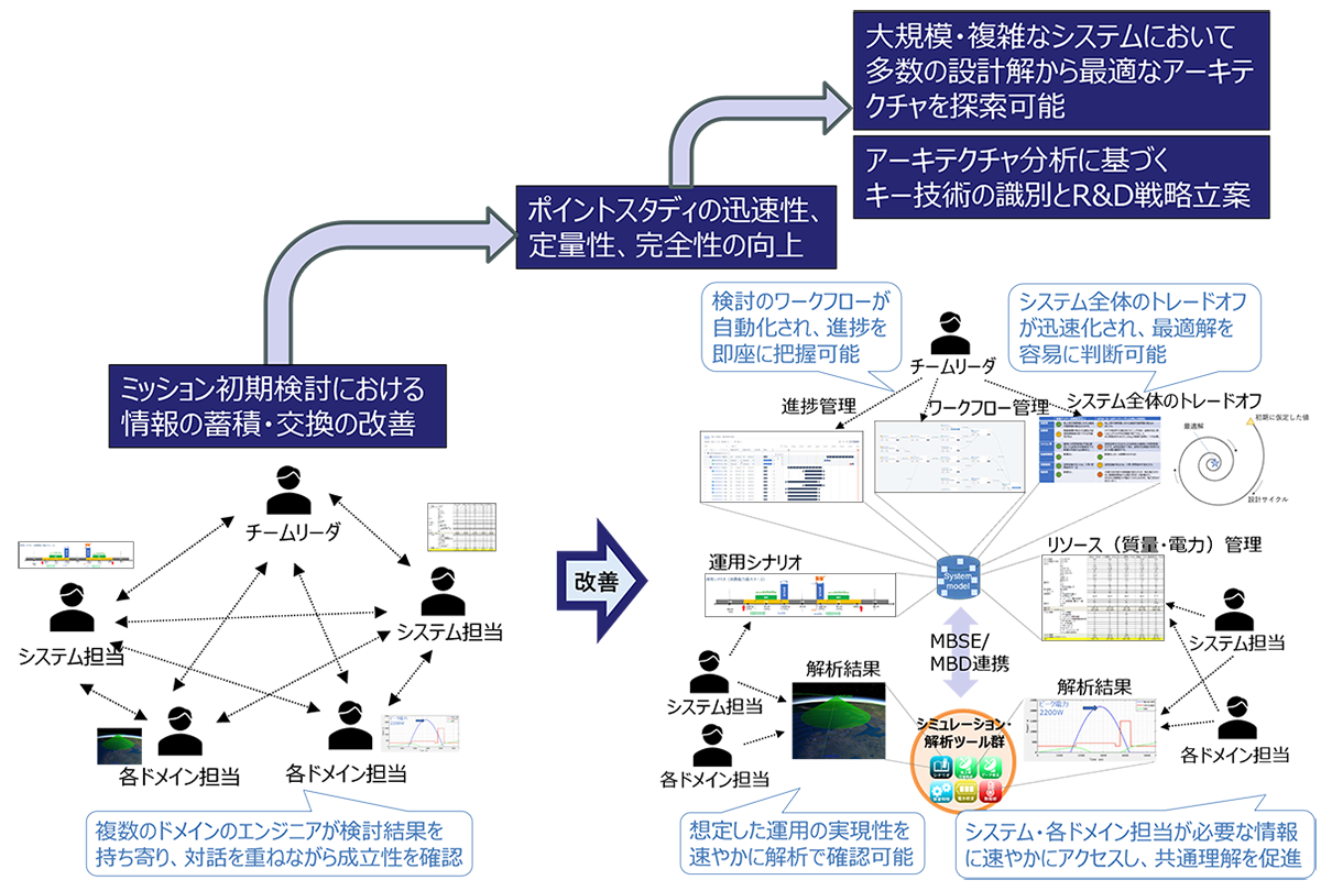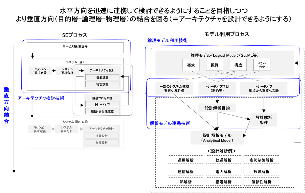 上流工程においてシステムのアーキテクチャを効果的に探索するための検討プロセス、顧客/サービスなどシステムの価値を高めるための検討プロセスを確立する。またミッション初期検討などにおいて、デジタル技術(MBSE、MBD等)を活用し、システム担当や複数のドメイン担当が必要な情報に速やかにアクセスでき、システム全体のアーキテクチャトレードオフや最適解探索を迅速かつ容易に可能とするための技術(方法論、ツール)の確立を進めています。